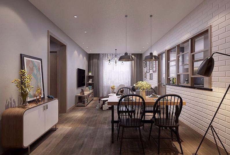2、餐廳:由于餐廳與客廳空間是相同的,所以餐廳家具選擇了帶有工業(yè)風(fēng)的餐椅,整個空間的設(shè)計簡約而不簡單。