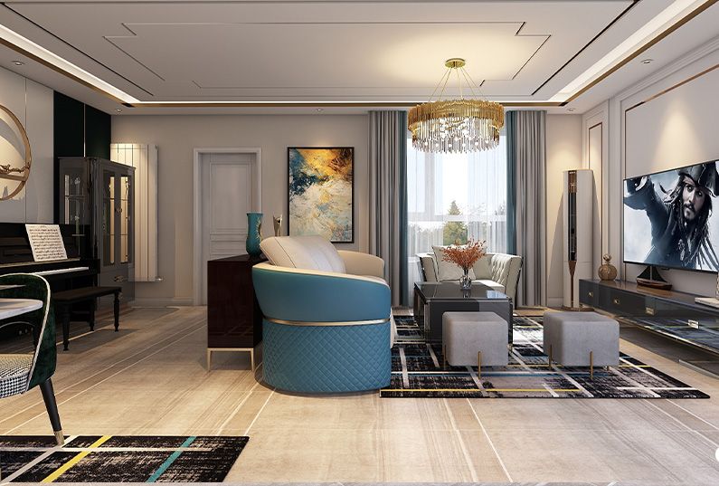 主題為現(xiàn)代輕奢風(fēng)格,簡約俐落的質(zhì)材鋪敘與敞明大方的格局尺度,是輕奢風(fēng)定調(diào)的設(shè)計居宅中,不可或缺的重要元素。在案例中,陳設(shè)藝術(shù)品及金屬線條材質(zhì)來營造大氣、自然、輕奢的裝飾美學(xué)氛圍。墻面、地面、家具陳設(shè)等均以簡潔的造型、精細(xì)的工藝為其特征,強調(diào)品質(zhì)感和細(xì)節(jié)處理。在色彩搭配方面以暖色為主,溫馨的客桌花束、明黃色的搭毯、直觀大氣的金屬材質(zhì),帶著淡淡的隨意,隨著輕輕的希冀讓人感受到的是空間彌漫的溫馨與舒暢。
