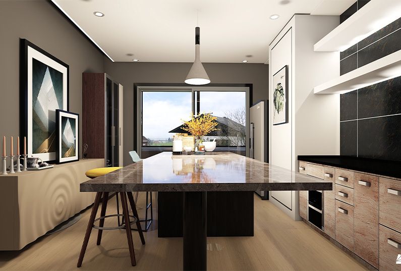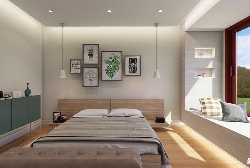 簡約俐落的質(zhì)材鋪敘與敞明大方的格局尺度,是現(xiàn)代風定調(diào)的設計居宅中,不可或缺的重要元素。在案例中,陳設藝術品及金屬線條材質(zhì)來營造大氣、自然、輕奢的裝飾美學氛圍。墻面、地面、家具陳設等均以簡潔的造型、精細的工藝為其特征,強調(diào)品質(zhì)感和細節(jié)處理。在色彩搭配方面以暖色為主,溫馨的客桌花束、明黃色的搭毯、直觀大氣的金屬材質(zhì),帶著淡淡的隨意,隨著輕輕的希冀讓人感受到的是空間彌漫的溫馨與舒暢。