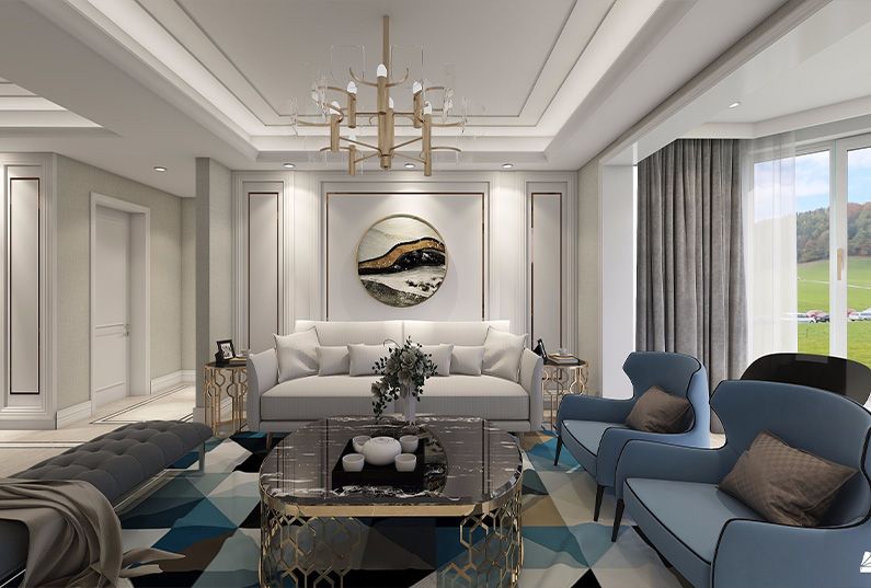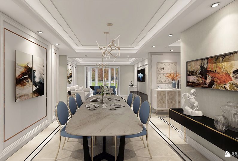 這套案例是一套法式雅致輕奢的設(shè)計(jì),保持了法式風(fēng)格中的固有風(fēng)格和理念,摒棄傳統(tǒng)法式的繁復(fù)、冗雜的裝飾造型與甜膩的色澤,轉(zhuǎn)而用經(jīng)典軸線、對稱布局的方式,嬰兒藍(lán)結(jié)合淺色淡雅的空間色調(diào)或幾何線條與典雅時(shí)尚的陳設(shè)軟裝,打造出一個(gè)法式輕奢主義的空間格調(diào)。