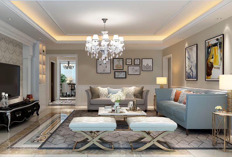 本案樓層10層、采光較好、南北通透、所以在用色方面、偏向于淺色、溫馨色、沙發(fā)壁紙有了一點(diǎn)藍(lán)色、咖色修飾.