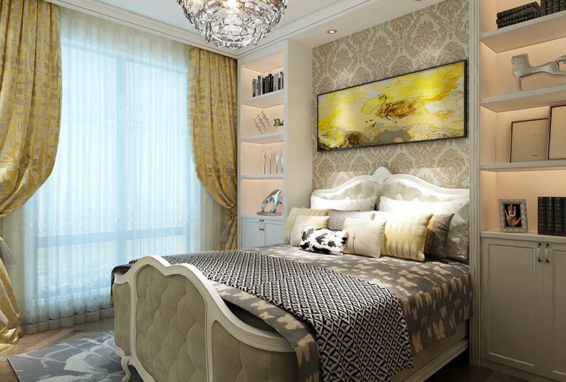 主臥強(qiáng)調(diào)簡潔、優(yōu)雅,淺色系的墻面搭配深色系地板,臥室床頭雅致的花紋壁紙配上淺色家具及布藝,舒展而溫馨,讓人心神安寧。