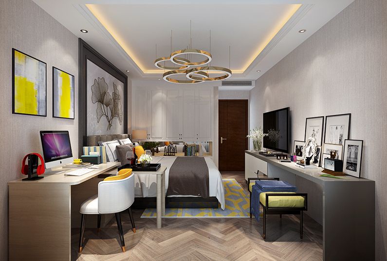 臥室:臥室的設計更是簡約,滿足業(yè)主的使用功能,不需要過多的裝飾,配備齊全的生活設施,希望在休息的時間更是全身心的放松,簡潔的家具和明快的色調(diào)設計都是臥室的風格設計。