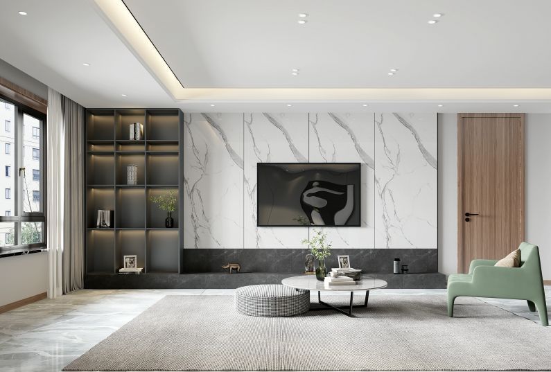 1. 客廳:淺色的墻面搭配地磚,大理石的電視背景墻,灰色的沙發(fā),深色的掛畫點(diǎn)綴整個空間,凸顯時尚的現(xiàn)代感。