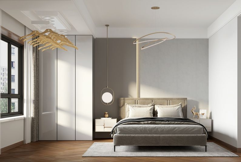 3. 臥室:臥室的墻面,淺棕色的地板,飄窗,加上暖色的燈帶,營造出舒適、簡約的氛圍。