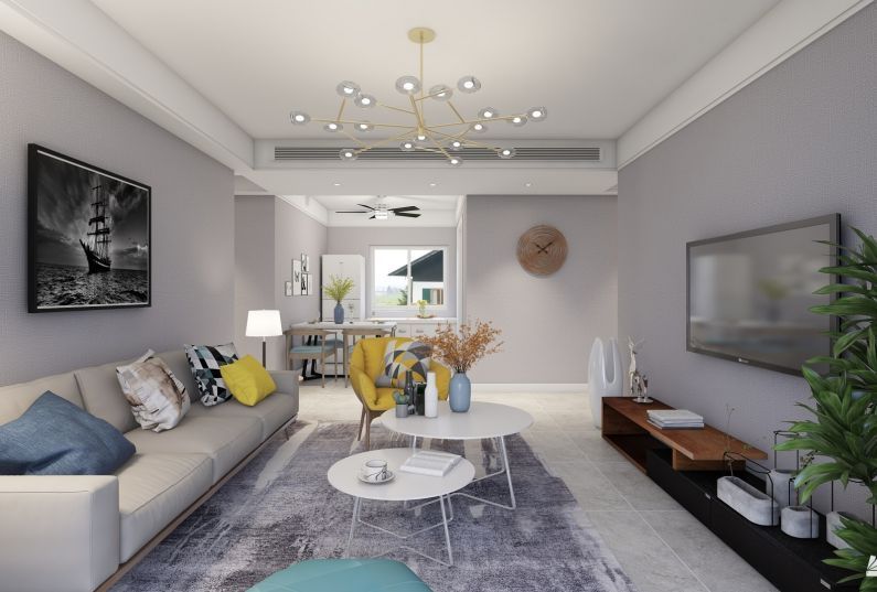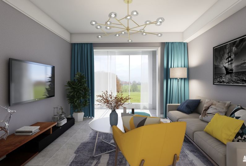客廳空間說明灰色帶給人寧靜的感受,客廳沙發(fā)點綴明黃色沙發(fā)和靠枕,搭配湖藍色窗簾,賦予了空間不一樣的氣質。