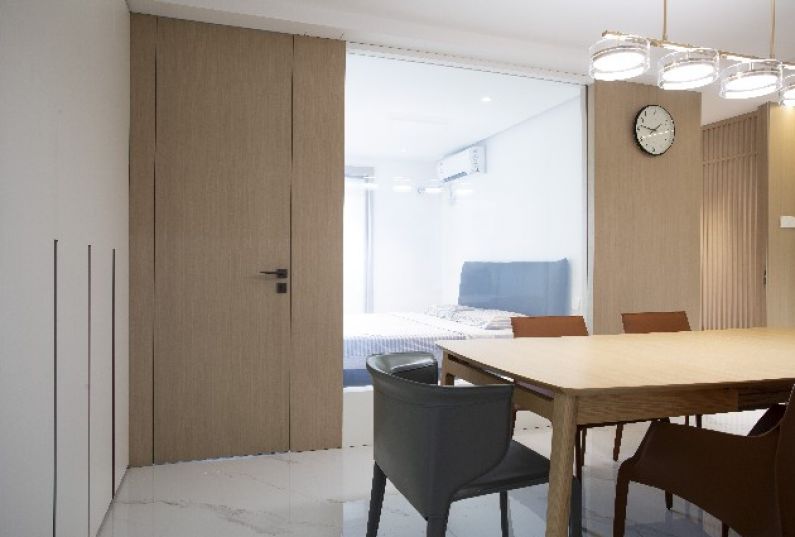 原結(jié)構(gòu)輕體墻拆除,原客廳位置增加臥室空間,隱藏門到頂,霧化玻璃分割活動區(qū)與臥室之間的私密性,原主臥室為孩子兩個孩子的休息學習娛樂的互動空間。原次臥室為老人居室和公共閱讀娛樂區(qū)。衛(wèi)生間改為兩個衛(wèi)生間??蛷d區(qū)用長桌代替?zhèn)鹘y(tǒng)沙發(fā)電視的功能。