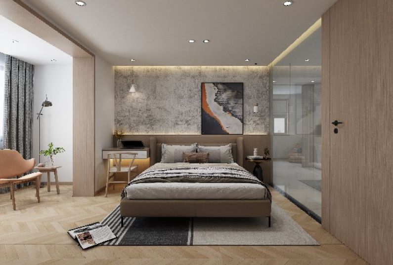主臥:主臥室和客廳用霧化玻璃的形式分割,增加客廳的采光的同時也保證臥室的獨立和私密性,臥室門采用高度到頂?shù)哪举|(zhì)隔音門,隔音問題可以解決,床體對面為整排衣柜,陽臺區(qū)為書房工作和休閑區(qū)域,增加儲物功能。