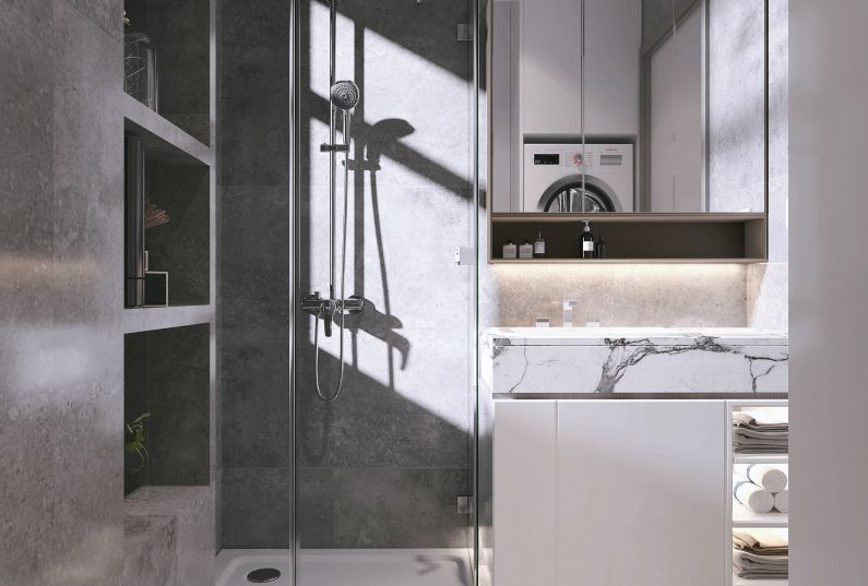 廚房外部區(qū)域?yàn)橄匆聶C(jī)與冰箱的放置區(qū),整體與煙機(jī)灶臺(tái)區(qū)用玻璃推拉門(mén)隔斷。平開(kāi)門(mén)關(guān)上便可隔離油煙。
