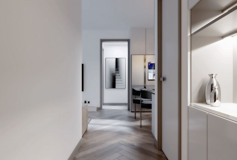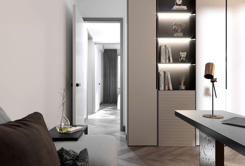 線條的搭配更顯質(zhì)感與簡(jiǎn)約。到頂?shù)墓褡釉黾恿耸占{空間,增添了生活趣味的同時(shí)也讓視線得以延伸,避免整面柜門(mén)帶來(lái)的壓迫感。
