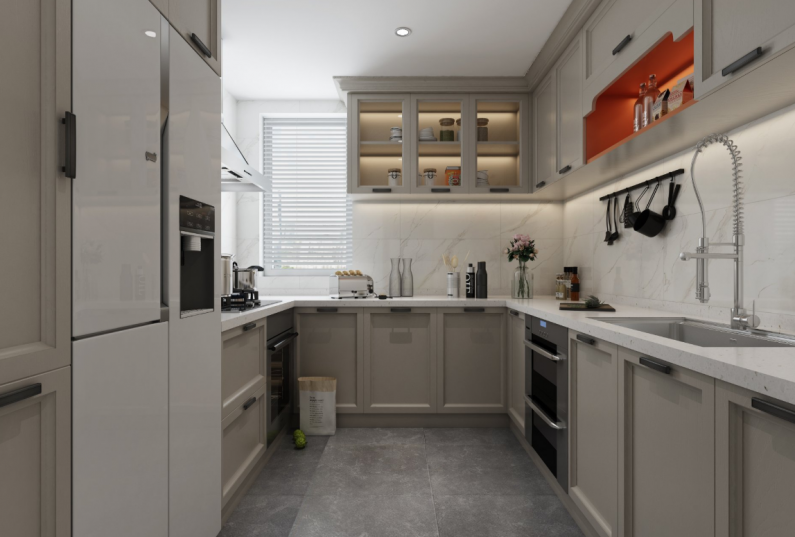 4、廚房柜體顏色統(tǒng)一,頂面采用防水石膏板吊頂,整體性更強,空間上更加簡潔;