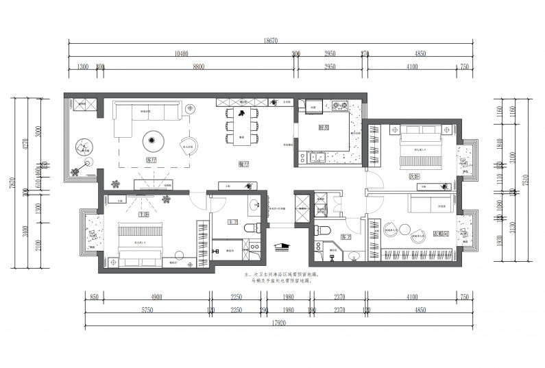 1、客餐廳一體,客廳要實現(xiàn)接待客人及基本功能,在此基礎上實現(xiàn)影視功能,餐廳以餐邊柜+餐桌設計方便實用;