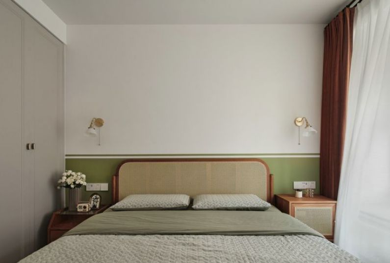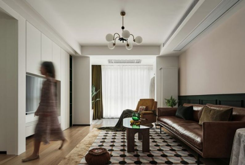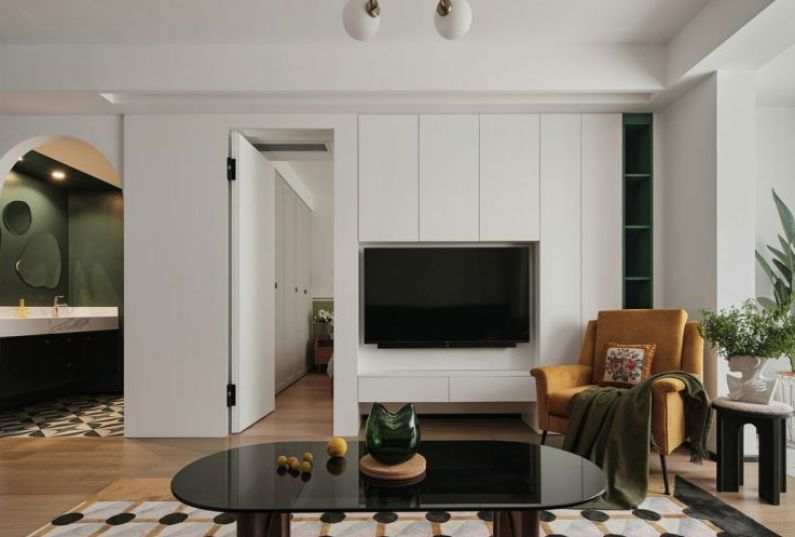所見即所愛,因為熱愛,所以多彩。墻面色調(diào)與家具的色彩碰撞,豐富的色彩組合,讓空間活潑生動。光線透過白紗,享受溫柔的自然光。客廳后面向南主臥是父母住的,隱形門打開,步入父母的房間。最愛那一抹綠,用墨綠色裝飾沙發(fā)背景墻,形成拼色效果,石膏線上墻層次分明,氣質(zhì)滿滿。棕色皮質(zhì)沙發(fā),玻璃茶幾,帶有幾何元素的地毯,復(fù)古的味道油然而生,設(shè)計一個家,圓一個夢。沙發(fā)邊幾用藝術(shù)花瓶稍作點綴,時而可以來些綠植鮮花裝扮,給生活多加些喜愛的色彩。電視背景墻,是通過將客廳與主臥的墻體打掉,借用了一些主臥面積增加客廳儲物,通過改變主臥進(jìn)入方式,也讓主臥的儲物空間變多。餐椅搭配卡座,滿足一家四口人的用餐需求,卡座還可以儲物。不經(jīng)意間,就能捕捉到空間里的一抹綠,不需要濃墨重彩,幸福的生活在點滴間相遇。