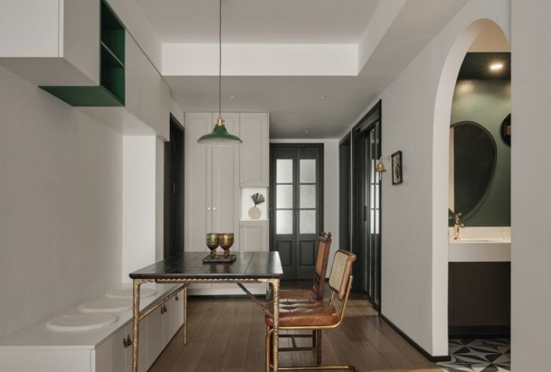 餐廳卡座上方的懸掛柜,特意留出一組開放式綠色柜,綠色吊燈與之呼應(yīng),功能與裝飾并存。
