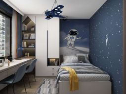 兒童房床一側(cè)的背景選用深藍色,另一側(cè)選用淡藍色,兩者與屋頂?shù)陌仔纬蓮娏业膶Ρ龋惨粋?cè)放書桌,另一側(cè)設(shè)計儲存柜,當深色與淺色碰撞,在搭配各種各種的裝飾品,色彩碰撞的美就此展開,童趣且有設(shè)計美感。