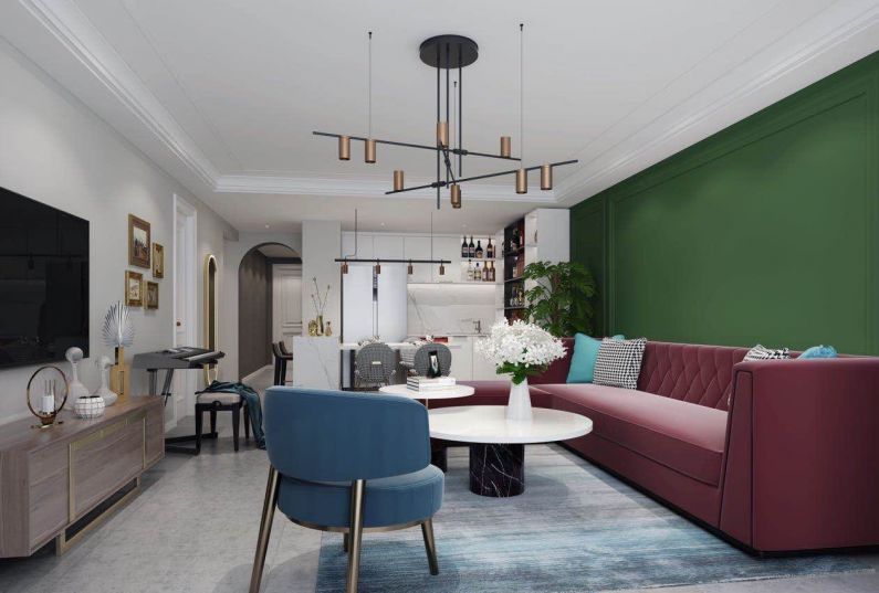 業(yè)主為三口之家,希望家里能體現(xiàn)色彩對(duì)比的視覺感,因?yàn)楝F(xiàn)場(chǎng)采光不錯(cuò),所以整體采用了孔雀綠,藍(lán)色等對(duì)比色,搭配簡(jiǎn)單的石膏線條和石材紋理的家具,彰顯了簡(jiǎn)約奢華的氛圍