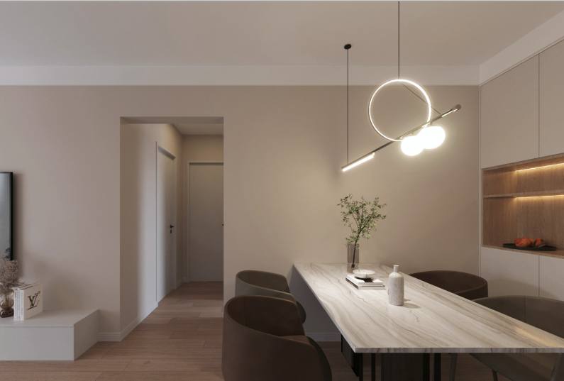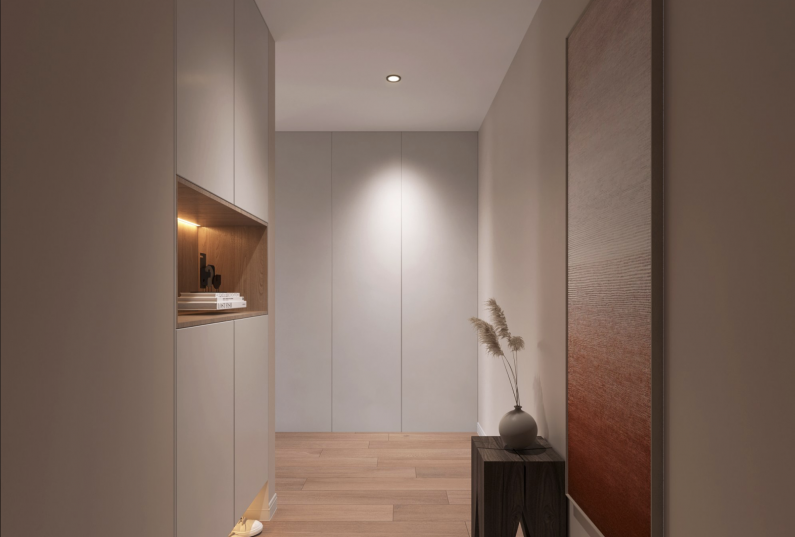 門(mén)廳:原門(mén)廳通道過(guò)于狹長(zhǎng),我們依靠定制柜體拉短了整個(gè)通道的間距,既保證了動(dòng)線的使用情況,又賦予了空間的功能獨(dú)立。