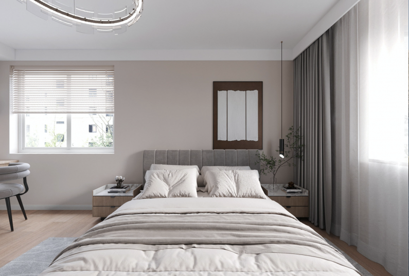 主臥:我們把原本兩個(gè)較小的房間合并在一起,擴(kuò)充了收納的同時(shí),也滿足了業(yè)主另外的休閑瑜伽空間。