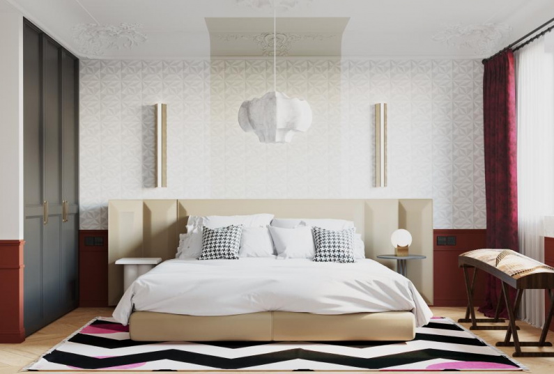 主臥:風(fēng)格與客廳協(xié)調(diào)一致,所呈現(xiàn)出時(shí)間的張力和空間的戲劇性,以及一種不期而遇的藝術(shù)性體驗(yàn)。純粹的灰色床品,整個(gè)空間和諧統(tǒng)一又靜謐沉穩(wěn)。