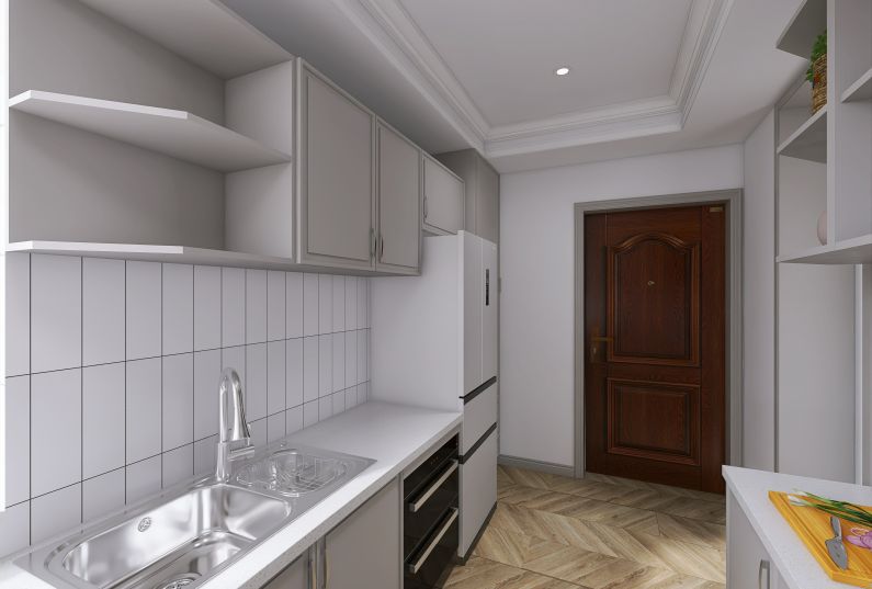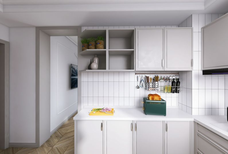 U字型造型裝飾櫥柜。配以白色小規(guī)格墻磚,使整個空間色調(diào)更加時尚,典雅。