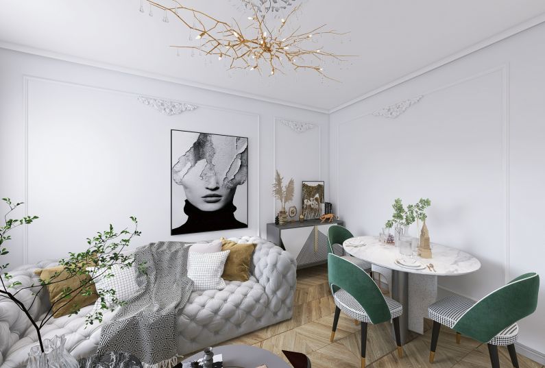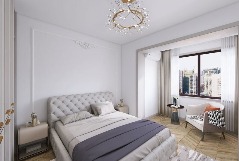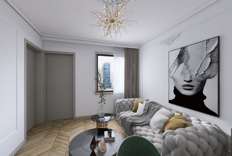 地面鋪貼原木色人字形地板,墻面粘貼石膏平線并點綴石膏雕花角線作為墻面裝飾,墻面涂刷白色的乳膠漆