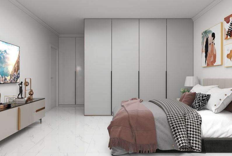 主臥空間是居家私密的空間,主臥設(shè)計(jì)的主要以舒適溫馨為主,臥室通鋪白色大地磚,衣柜采用木制線條,用造型突出家具的色彩。