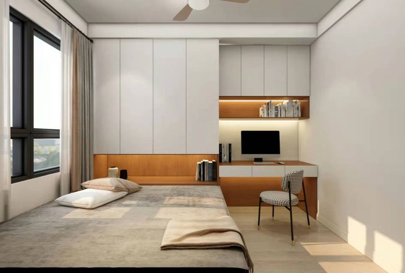次臥空間榻榻米和整面墻的衣柜和書(shū)柜既滿足了客房功能又補(bǔ)足了收納空間。