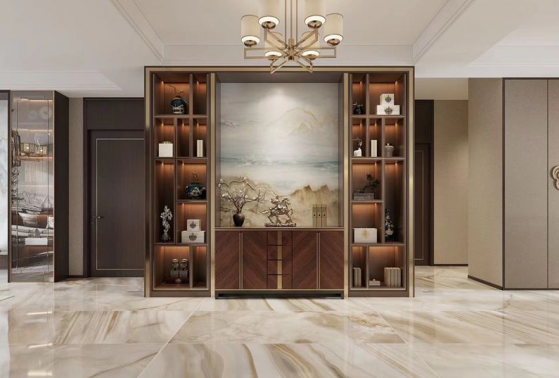玄關(guān)是很中式的一個(gè)玄關(guān)柜,中間是中式壁畫,兩側(cè)是展示的多寶格。