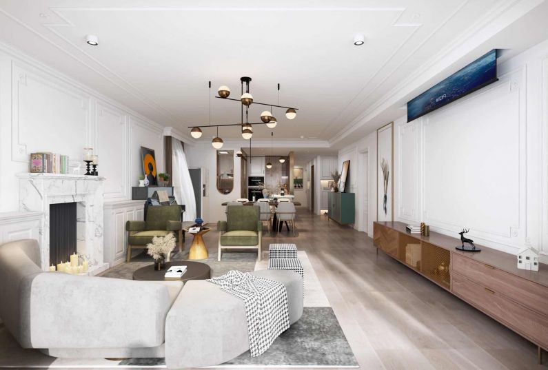 入戶玄關(guān)兩扇造型金屬邊框的長(zhǎng)虹玻璃把采光給到旁邊空間。同時(shí)也提升了入戶的儀式感??筒蛷d空間連貫,墻頂面是北歐風(fēng)格的造型線條。家具燈飾的元素也是配合整體風(fēng)格。