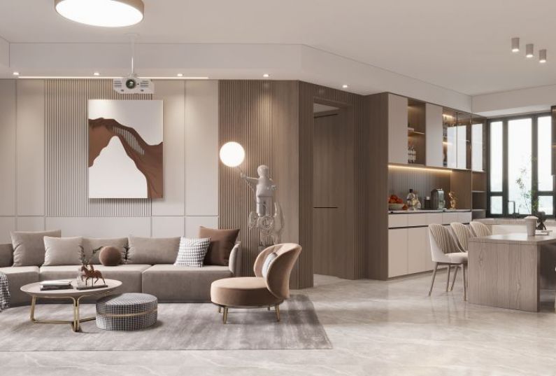 設計說明這是一套145㎡的住宅,客餐廳面積開闊,采光良好,但為異形戶型。業(yè)主為細節(jié)控、愛干凈,喜歡超大的空間感,所以在房屋整體規(guī)劃時,設計師多采用簡潔自然有質(zhì)感的材質(zhì)、通透布局、細節(jié)刻畫,來呈現(xiàn)空間最佳的狀態(tài)。