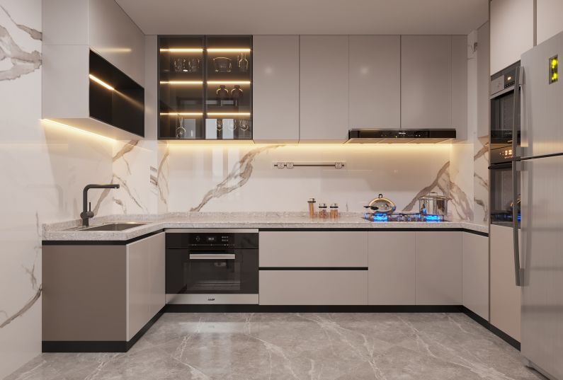 2.業(yè)主對于廚房的要求,便是可以滿足中西餐;于是并入一個小空間增大廚房面積,增加島臺設計,可做中西雙廚功能;考慮到空間感,廚房規(guī)劃使用墻推門,讓家居不擁擠。