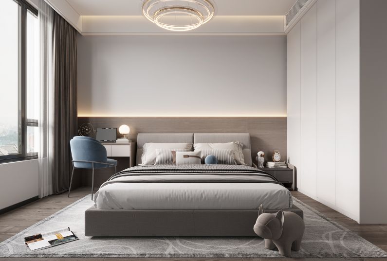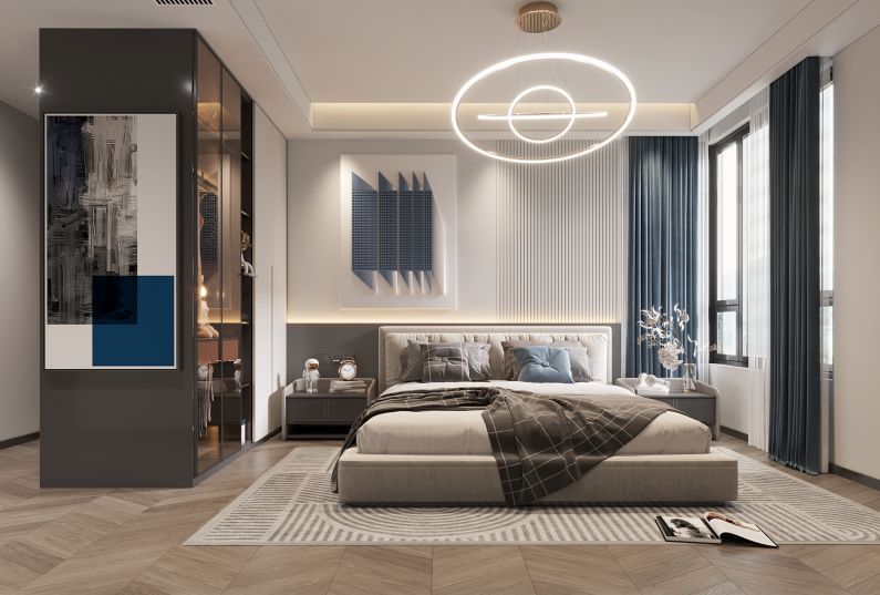 3.原始主臥的面積很大,設計師合理利用空間規(guī)劃休息區(qū)+衣帽間+主衛(wèi)的套間系統(tǒng),提升居住舒適度。配色上,用奶咖的暖搭配深色,點藍色軟裝,讓空間既擁有自然氣息,也成全時尚感。