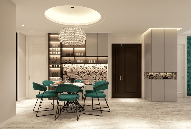 1.門廳餐廳: 利用門廳玄關(guān)柜做過渡,劃分區(qū)域,增加門廳使用功能。圓形吊頂設(shè)計和吊燈是整個餐廳的亮點,加上精致的巖板餐布擺設(shè)跟電視背景墻相互呼應(yīng),增加空間整體感和居住活躍感。