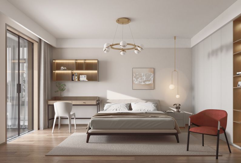 和主臥和兒童房的色彩搭配不同,次臥使用了更為穩(wěn)重的莫蘭迪色系,延續(xù)客廳空間的整體風(fēng)格。