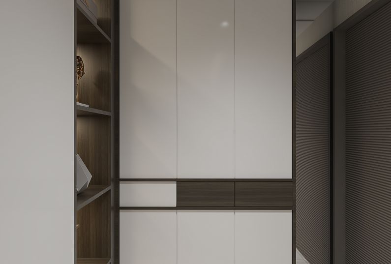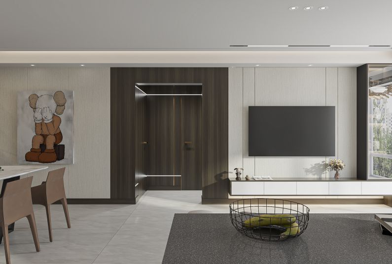門廳玄關(guān),設(shè)計(jì)掛衣區(qū)、展示區(qū)、換鞋區(qū)。因采光較差,設(shè)計(jì)玻璃及啞光烤漆飾面相結(jié)合,延伸及提亮此空間。