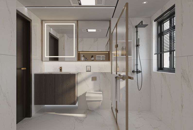 主衛(wèi),馬桶改動(dòng)位置,建議做壁掛馬桶,做無(wú)衛(wèi)生死角設(shè)計(jì)。進(jìn)衛(wèi)生間后右手邊臉盆、儲(chǔ)藏柜,方便存放衛(wèi)生間一些物品等。