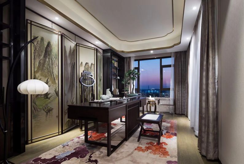 背景以“山”為創(chuàng)作文本,形成書畫房主背景,預(yù)示著背有主人“靠山”,讓空間更加具有層次感與設(shè)計(jì)感?!扒饺f水看過,淡泊寧靜于胸”,在一個(gè)寫意空間中冥思未嘗不是一種享受。 以“慢”為設(shè)計(jì)形態(tài)的書桌椅組合,古色古香,同時(shí)與空間相融一體。傳遞著“慢生活”的生活方式,以形動人。 天花采用象征純潔、高雅、清凈、自然的蓮花瓣造型吊頂,將東方禪意元素融入空間,結(jié)合木質(zhì)格柵形成的層次感,韻味典雅的新中式空間氛圍躍然眼前。