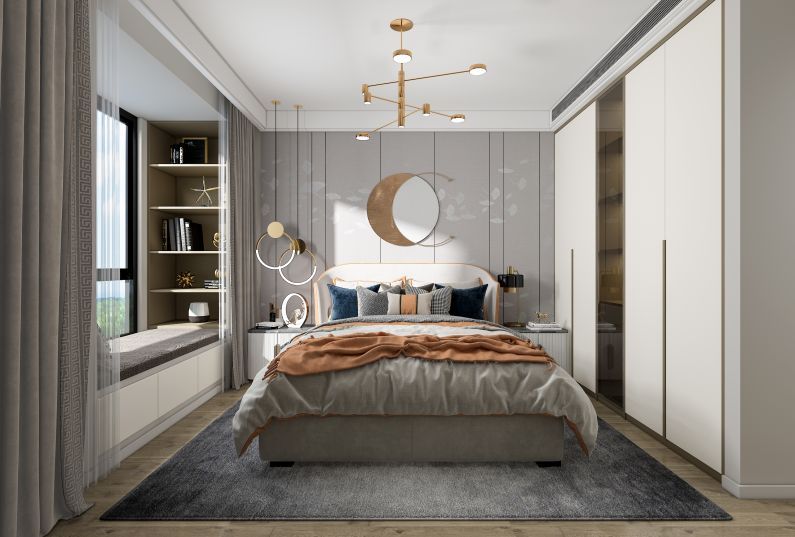 臥室采用陳靜的色調(diào),注重功能和空間組織,崇尚大氣低奢的構(gòu)成工藝,造型簡(jiǎn)潔,不同層次的灰色相互搭配,緩解視覺疲勞,營(yíng)造紳士壓制氛圍。