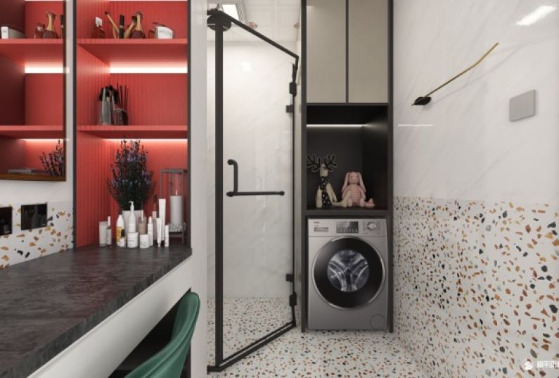 衛(wèi)生間:采用大面積的白色瓷磚搭配復古的水磨石花樣瓷磚,使空間更加通透明亮;整體定制浴室柜的色系設計以灰色為主,玫紅色與復古綠色加以點綴,也是跟整個室內空間相呼應,大面積的鏡面使得視覺效果上增大了整體空間;進門右手邊是洗烘一體機,整個空間處處體現(xiàn)著簡潔實用。