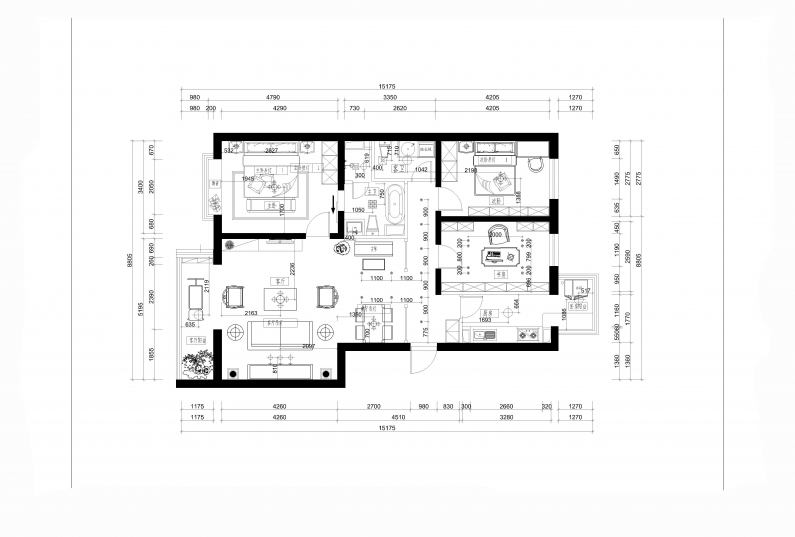 本案結(jié)合中國傳統(tǒng)設(shè)計的莊重與優(yōu)雅雙重氣質(zhì)。更多的結(jié)合了現(xiàn)代手法,把傳統(tǒng)的結(jié)構(gòu)形式通過重新設(shè)計組合以一種標志元素的形式出現(xiàn)。如地毯采用水墨畫的形式、臥室軟包的花紋采用刺繡的形式等等。更好的提升了中式的元素和主人的品位與內(nèi)涵??臻g上則重新組合,劃分層次,將中式與現(xiàn)代巧妙兼柔,大氣古雅。