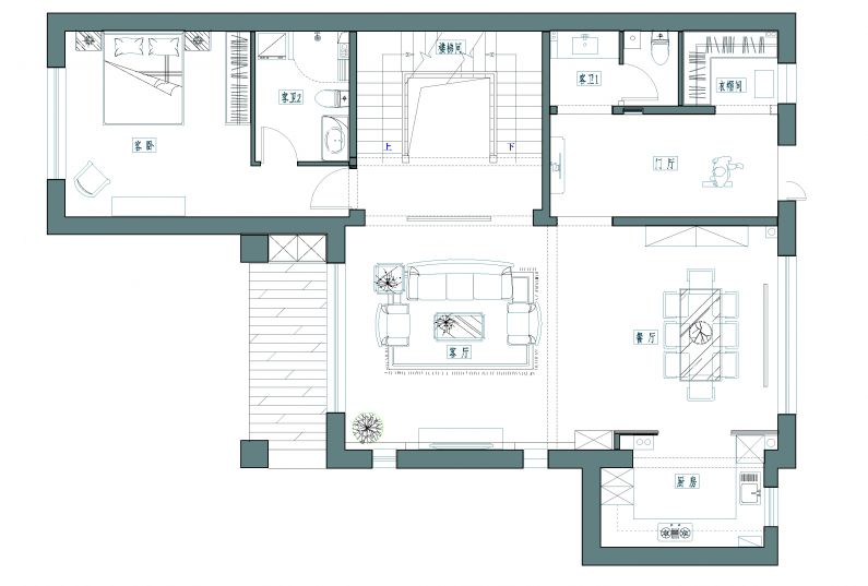 客廳餐廳頂部線條鑲嵌呼應地面簡潔造型劃分空間區(qū)域,護墻板整體包墻與電視墻石材搭配,增強背景的立體層次感,廚房護墻板后隱藏推拉門使出入洞口最大化。