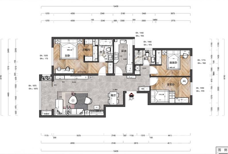 本案主要運用白色為主調(diào)顏色,灰藍色作為輔調(diào),電視背景墻采用藍灰色硬包裝飾,白色珍珠裝飾點綴,搭配金屬線條材質(zhì)裝飾。