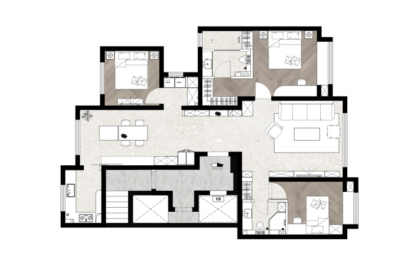 在本案設(shè)計(jì)手法上,用原木紋與灰色等一些經(jīng)典元素滲透到整案設(shè)計(jì)中,達(dá)到了溫馨舒適的效果