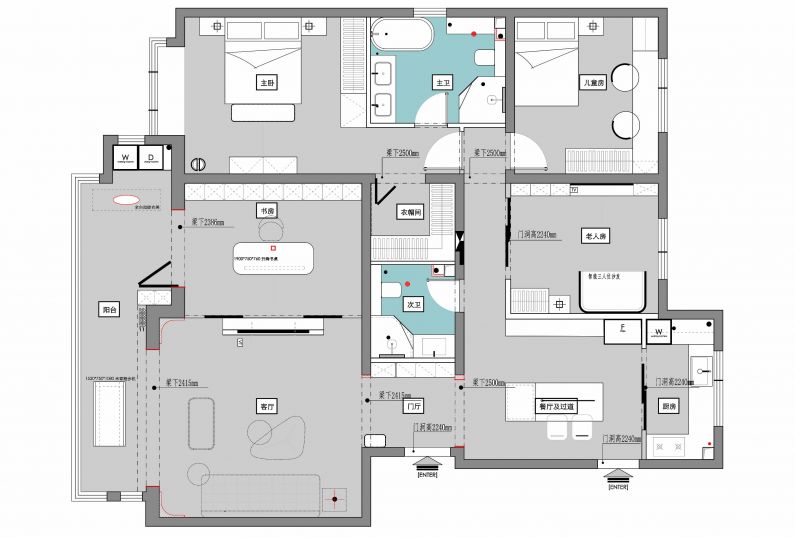 本次戶型是180平米4居空間, 在保留原有空間的使用功能上, 設(shè)計(jì)師在空間上細(xì)致定義;?:書(shū)房做成開(kāi)合空間, 時(shí)而形成回游動(dòng)線, 增加空間互動(dòng)與趣味性, 時(shí)而形成密閉書(shū)房空間, 有自己獨(dú)處的看書(shū)環(huán)境, 還有通過(guò)通過(guò)折疊門(mén), 望向窗外的遠(yuǎn)山;?:老人房的門(mén)做成玻璃門(mén), 給過(guò)道借光線增加空間感受, 同時(shí)使過(guò)道空間有視覺(jué)上的變寬;?:把原來(lái)空調(diào)室外機(jī)的位置融合,分離出來(lái)一個(gè)洗衣機(jī)的位置,使洗衣晾曬更加便捷;