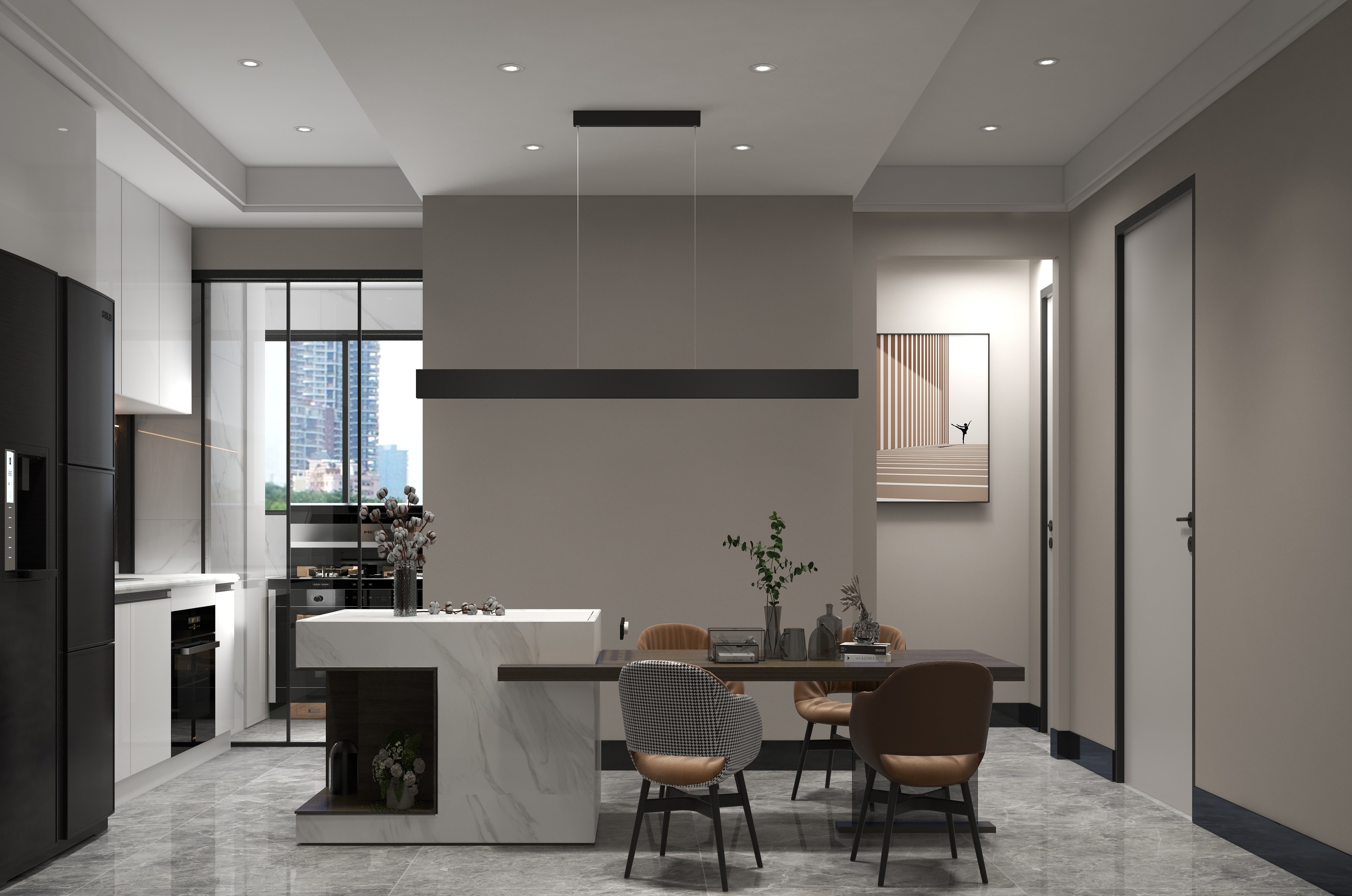 總體說明:高品質(zhì)的裝修設計講究品位,是設計師深思熟慮過后得出的別有心裁的簡潔設計,而非是簡單的堆砌和疊加。在空間效果和意境上,有著帶有韻味的要求,需要做到低調(diào)又不失雅致,冷淡又不失人間煙火和家的溫暖。在色調(diào)上,本次設計主要采用了黑白灰為主,棕色類、原木色為輔,營造出藏在冰冷背后的溫暖感和親切感,打造了最基本的設計美感和功能需求。燈光之間營造出可明可暗、花非花、霧非霧的朦朧效果,又恰到好處滿足了基本的使用需求。暖光下打造出對于溫馨家庭氛圍的期待,生活動線也帶上了流暢的弧度。