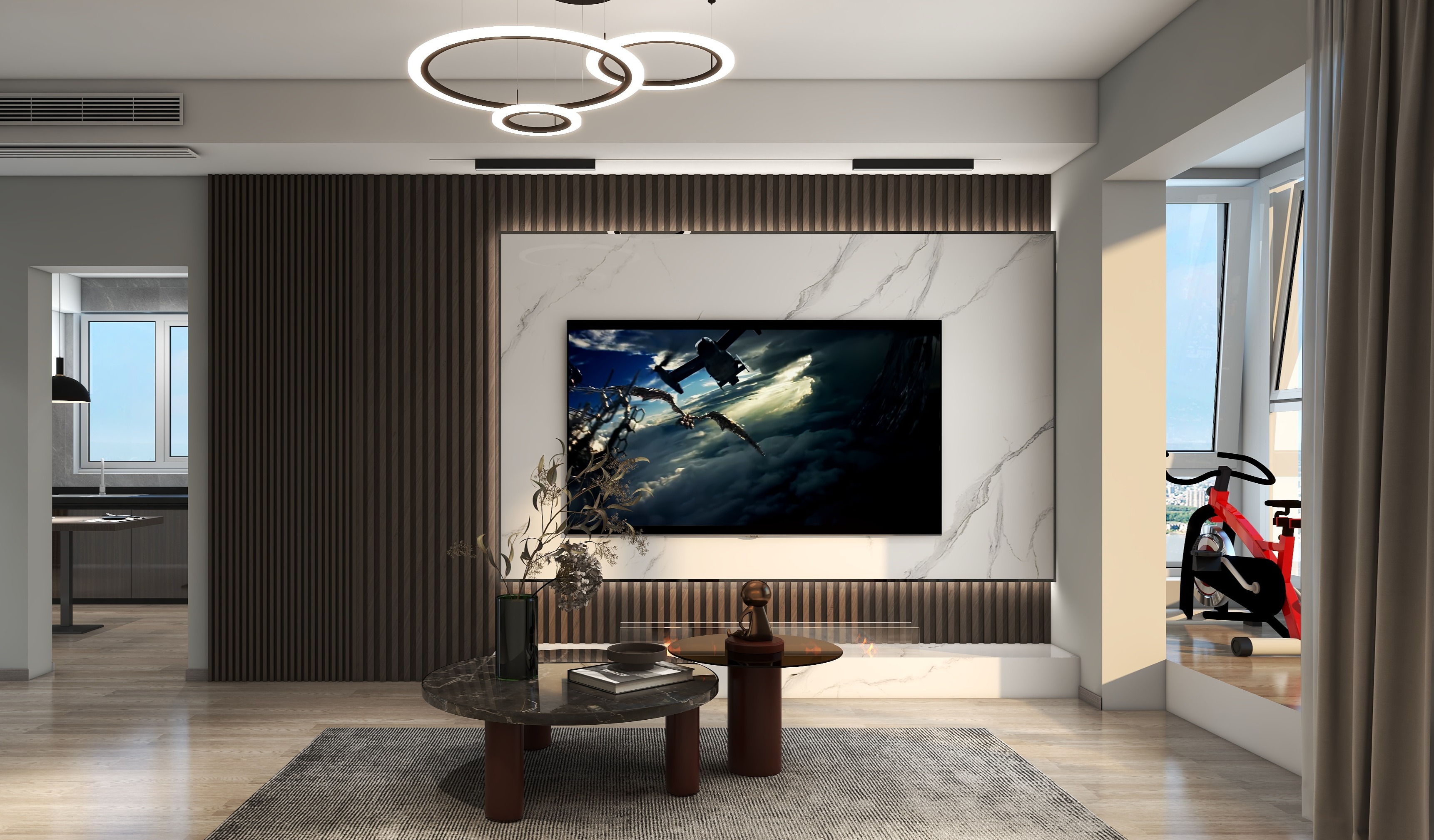 擁有人間煙火的干凈氣息。本案的整體設(shè)計使用黑白灰色系給予了空間理性簡約的基調(diào),黑白灰的碰撞打造出極簡又極具時尚感的空間氛圍。入戶的玄關(guān)柜運用不同材質(zhì)的碰撞堆疊打造立體幾何感,簡單又具有設(shè)計感,實用與美觀相輔相成??蛷d電視墻為了讓整面墻整齊劃一,設(shè)計了隱形門+巖板設(shè)計。用巖板瓷磚上墻做裝飾,點綴了胡桃木格柵板。主臥的設(shè)計延續(xù)空間的整體風(fēng)格,以簡約線條為基調(diào),黑白搭配打造寧靜舒適的休憩空間體驗。空間中線型燈光的設(shè)計給空間加了分。光影如同空間的魔法師,賦予了空間豐富的表情,體現(xiàn)出空間年輕時尚的一面。
