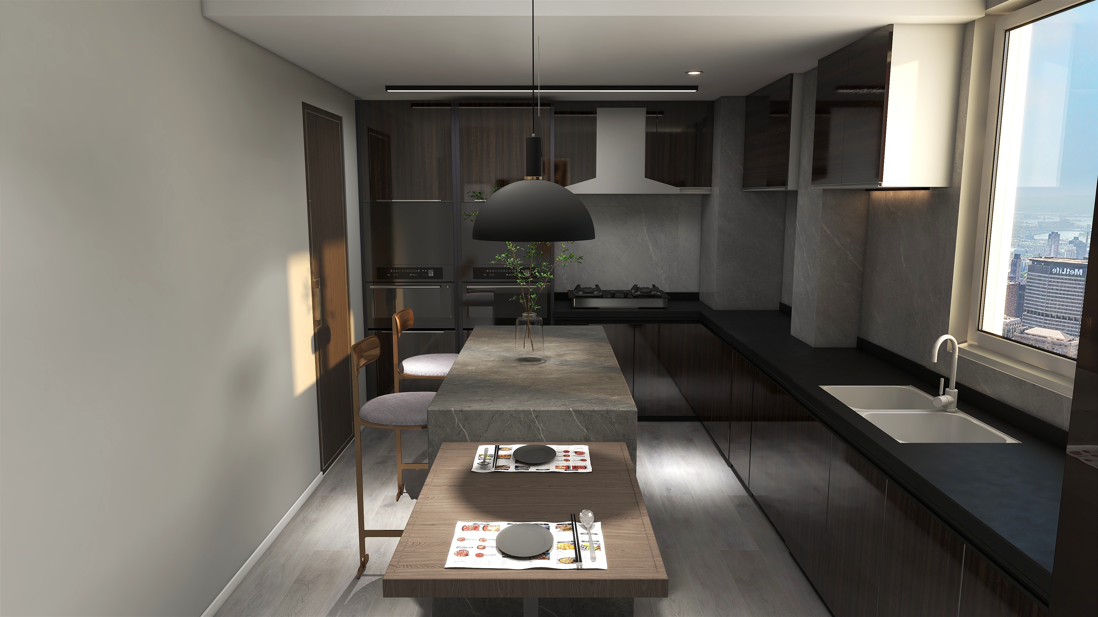 廚房過于小,利用率不夠。為了滿足中西廚,單獨把次臥室拆除改成開放式廚房+餐廳功能。