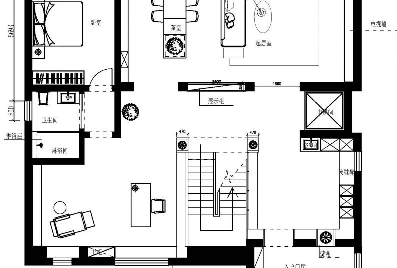 首層門廳集收納與風(fēng)水局為一體,枯山水與屏風(fēng)將樓梯隱于它原本不該凸顯的位置