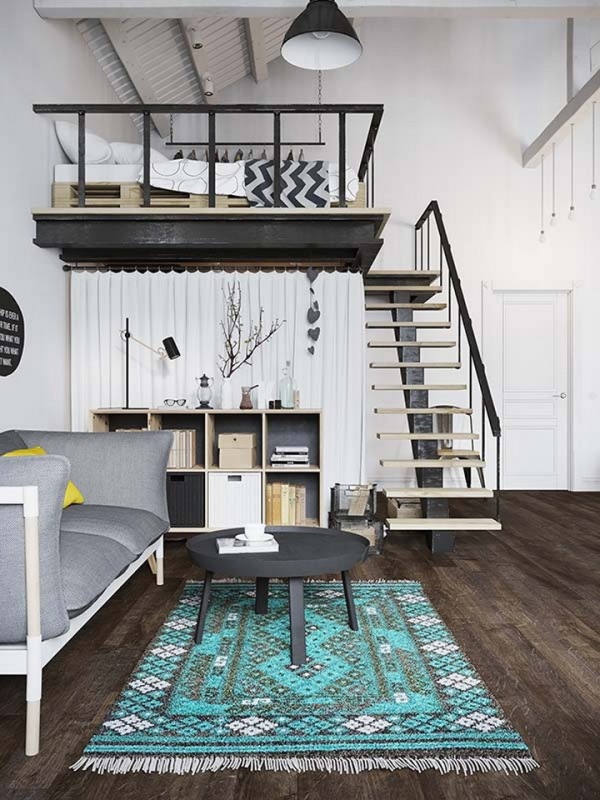 公寓面積不大,主人是一對年輕夫妻,為了盡量節(jié)省空間,沒有單獨的劃分臥室,而是將其放到了局部的二層夾層上,下方用布簾圍合出一處衣帽間及儲藏間。
