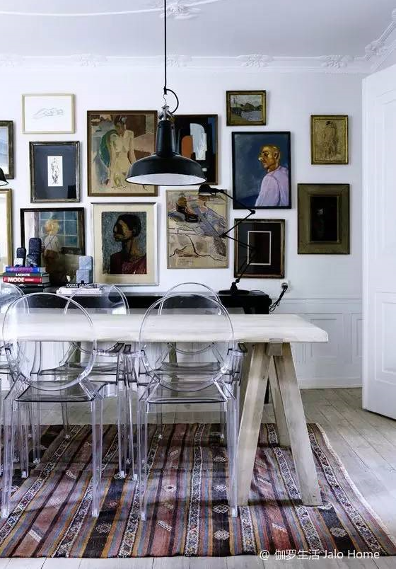 房頂花紋繁復(fù)的石膏線、墻上不同繪畫風(fēng)格的掛畫、地上的kilim地毯、粗獷的實木桌子,再加上幾把能連接古今的幽靈椅,一切都那么和諧。